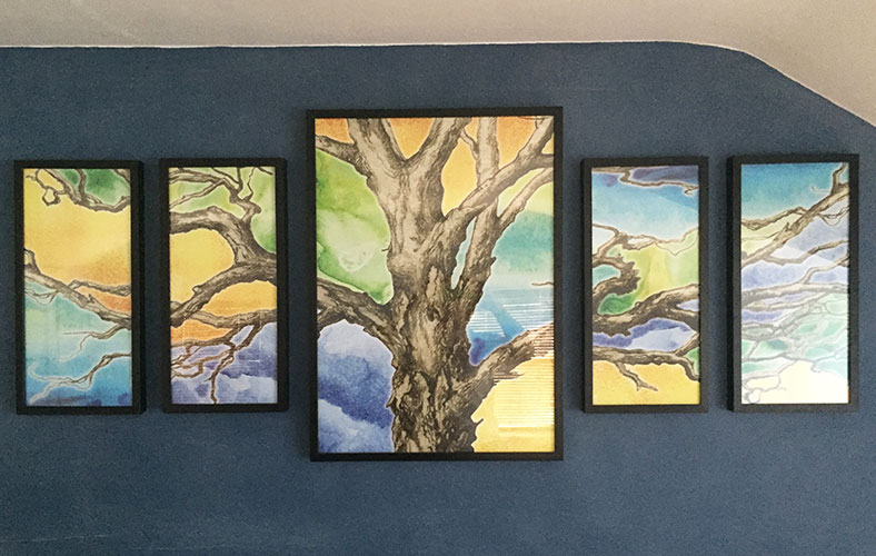 I was really happy with the look of the tree images in our bedroom, and decided to continue that idea. I started scoping my favorite stock sites for some hand-drawn food images, and found these. I love the citrus one! I did some work in Illustrator and Photoshop to formulate the paths, and layered watercolor images in the background.